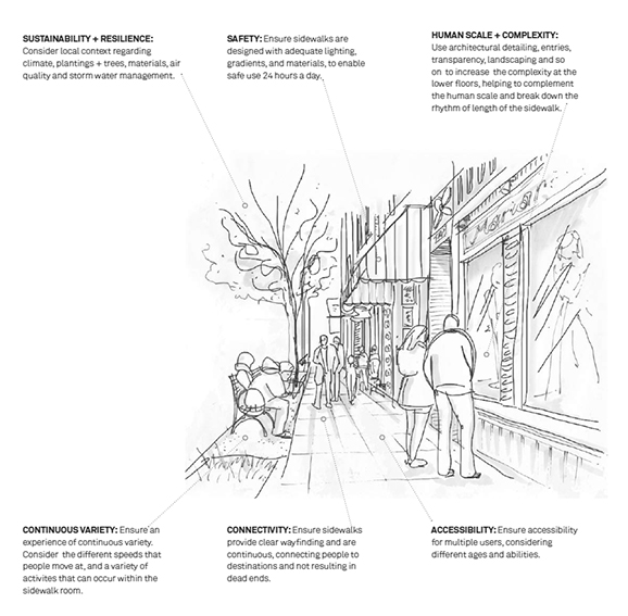 “Active Design: Shaping the sidewalk” es una herramienta de diseño publicada como documento en 2013, producto de un estudio desarrollado por el New York City Department of Design and Construction, con la finalidad de mejorar la salud de las personas a través del caminar. La premisa era que, mientras más confortables y atractivas fuesen las calles y las aceras, las personas caminarían más y mejorarían su salud. Este estudio indaga en los factores que determinan una buena experiencia viandante por la acera; elementos que al mismo tiempo determinan la calidad del entorno urbano: accesibilidad, conectividad, variedad continua, escala humana y complejidad, seguridad, sostenibilidad y resiliencia.