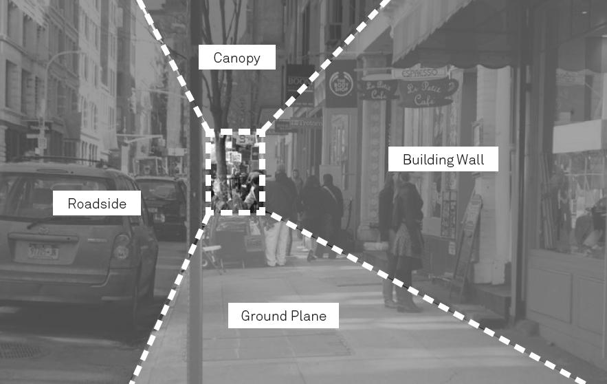 El análisis se centra en el espacio físico que constituye la calle a partir de la vivencia peatonal de la acera, pero en relación a la configuración de ésta como un todo compuesto por elementos físicos: diseño, mobiliario urbano, actividades, dimensiones y escala, al tiempo que éstos elementos construyen espacio en la experiencia y percepción de las personas. El “Active Design” plantea que la acera es visualizada por los viandantes como una habitación, «un espacio de cuatro planos»: la calzada, la acera, la fachada de los edificios en el nivel peatonal y la fachada edificada por encima del nivel peatonal. Esta concepción del espacio refiere que la experiencia de quien camina por una acera está condicionada por lo que ocurre arriba, en ambos lados de la acera y en la propia acera. «La acera no es un lugar estático, posee una condición dinámica».