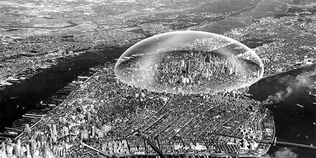 Poco más de doscientos años después de plasmarse la idea en papel del Cenotafio de Newton, el arquitecto Richard Buckminster Fuller pensaba en uno de sus más ilustres proyectos, una cúpula sobre Manhattan. El concepto de cúpula geodésica fue ideado por el ingeniero alemán Walther Bauersfeld a principios de los años veinte, pero Fuller patentó la idea veinte años después en Estados Unidos[1]. El diseño de una gigantesca cúpula de vidrio que podría contener «al menos la octogésima parte de la superficie total de los edificios New York» pretendía ser un elemento de protección que permitiría reducir la pérdida de calor en épocas de invierno, lo cual reduciría el gasto energético. Considerando que en 1968 la tecnología podía permitir a la arquitectura ser más audaz y extravagante, el proyecto no llegó a construirse por objeciones políticas, de propietarios de tierras y detractores a pesar de la prospectiva de gran ahorro de costos y materiales; según Fuller «mientras más grande es la estructura mayor es el ahorro de materiales»[2]. Sin embargo, la experimentación con estructuras geodésicas que llevó a cabo Fuller ha servido para desarrollar, a otras escalas, cerramientos y cubiertas en grandes espacios y edificios industriales.