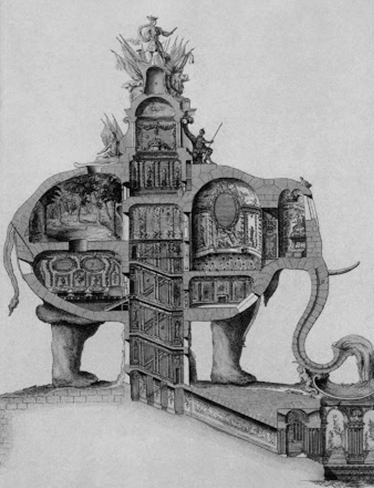 Elefante Triunfal, Charles-François Ribart de Chamoust. París, 1758. Fuente: Phantom Architecture, Philip Wilkinson.